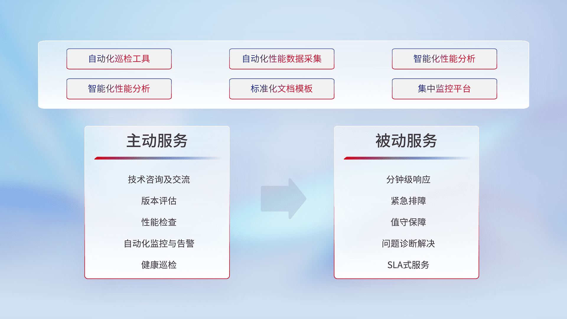 智能化工具和标准化文档,,保障服务质量,,提供主动服务(包含技术咨询、、版本评估、、、、性能检查、、自动化监控与告警、、、、健康巡检)和被动服务包含(分钟级响应、、、、紧急排障、、、值守保障、、、问题诊断解决、、、、SLA服务)。。。